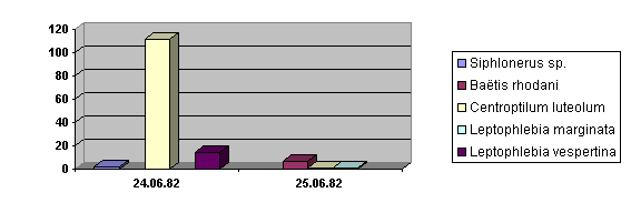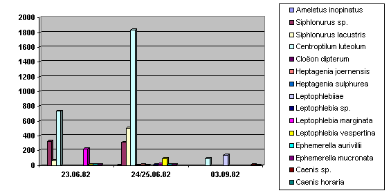 Centroptilum luteolum utgjorde 61 % av døgnfluefaunanen i juni (1982). Siphlonurus lacustris, Leptophlebia marginata og Leptophlebia vespertina var også forholdsvis tallrike i juniprøvene, mens de øvrige arter forekom sporadisk og fåtallig. I septemberprøvene ble bare 3 arter påvist, og i forholdsvis lite antall. Juniprøvene i 1983 viste en tilsvarende artssammenheng og dominansforhold som i juni 1982. "Resultatene viser et artsutvalg og dominansforhold som er uvanlig for elvelokaliteter, og dette gjenspeiler de spesielle forhold en har i stilleflytende deler av Nidelva". Baëtis rhodani, som oftest dominerer døgnfluefaunaen i Sør-Trøndelag (Koksvik og Haug 1981, Koksvik og Nøst 1981, Arnekleiv og Koksvik 1980), var til stede på bare et prøvested i Nidelva. (Gjengitt med tillatelse fra Koksvik).